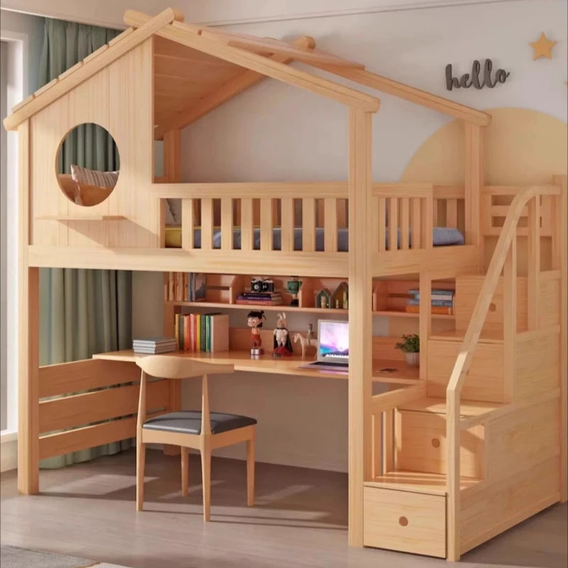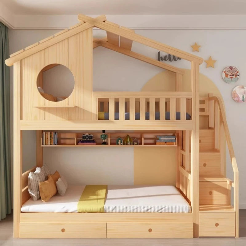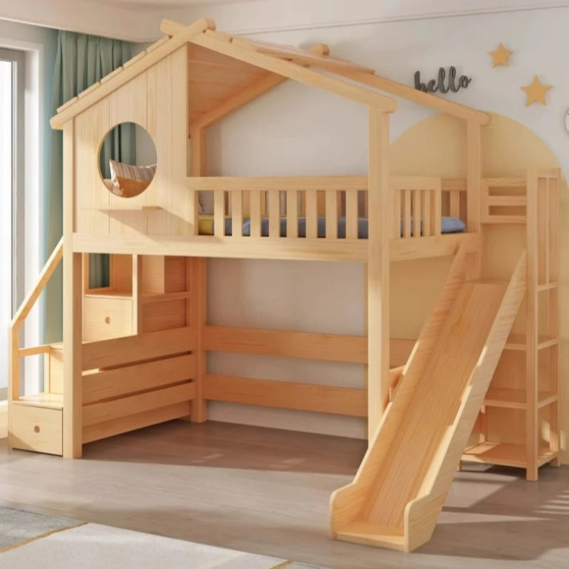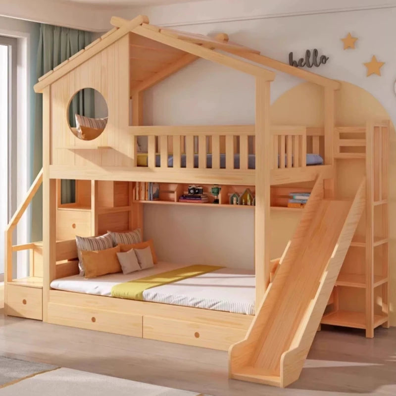 Lit Cabane Bois Massif Double avec Toboggan - Style Maison